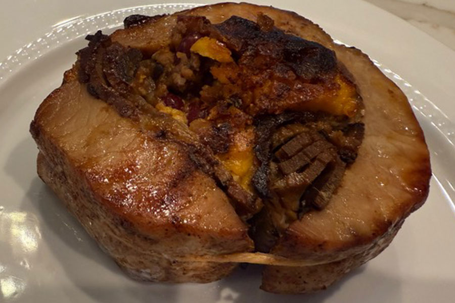 A pork loin roast is wide and thick, with a sizable (yet very tender) fat cap running along the top, unlike a narrower pork tenderloin with much less fat. Roast our boneless pork loin roast fat side up (to keep those savory juices flowing) at about 20-25 minutes per pound at 350 °F. Remember, this isn’t chicken, so a little pink is okay.