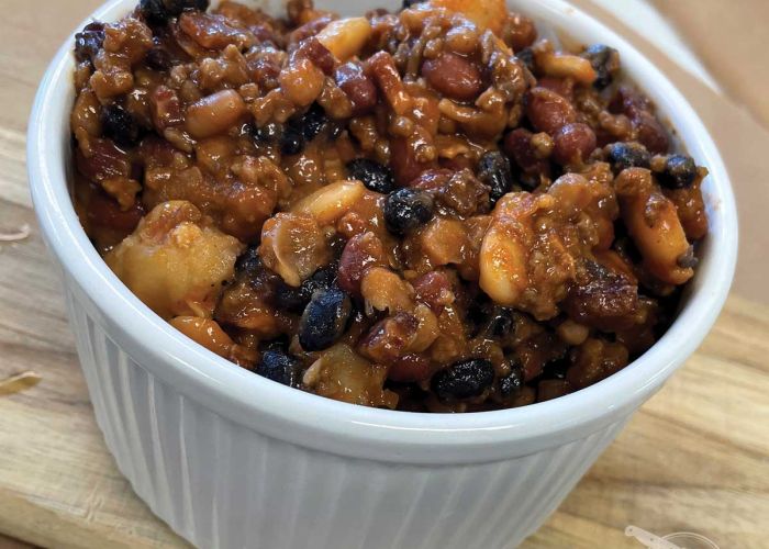 Black beans, butter beans, kidney, and navy beans sweetened with a bit of brown sugar and baked with freshly ground Hagberg’s burger and Hagberg’s smoky bacon.