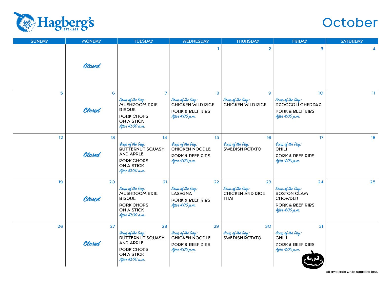 Soup’s on! Like everything we do at Hagberg’s, our soups are created to impress. Fresh ingredients and creative recipes combine with the expert craftsmanship of our Saucier. (In case you’re wondering, Saucier is a fancy way of saying “Soup Maker.”) During soup season, we’re busy chopping, dicing, and stirring the pot in the Hagberg’s kitchen with all kinds of fresh and delicious soups – from classic Chicken Noodle and Tomato Pesto to Jambalaya and Bacon Cheeseburger, and each weekday, we feature a different one.