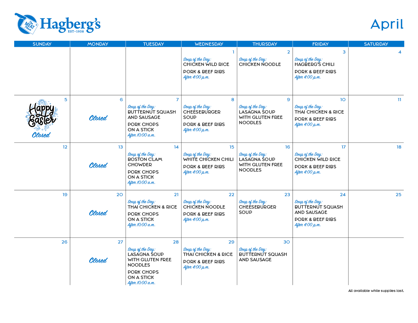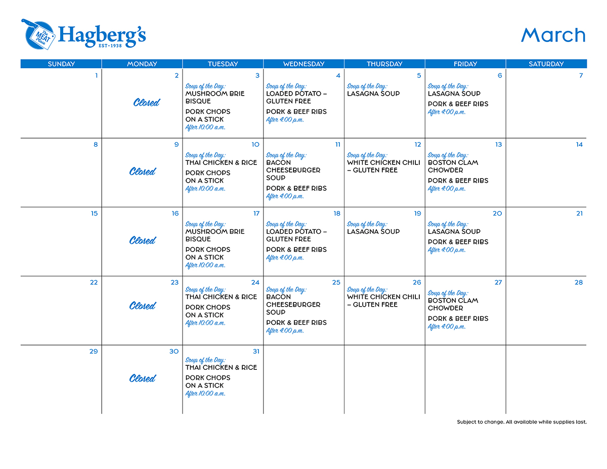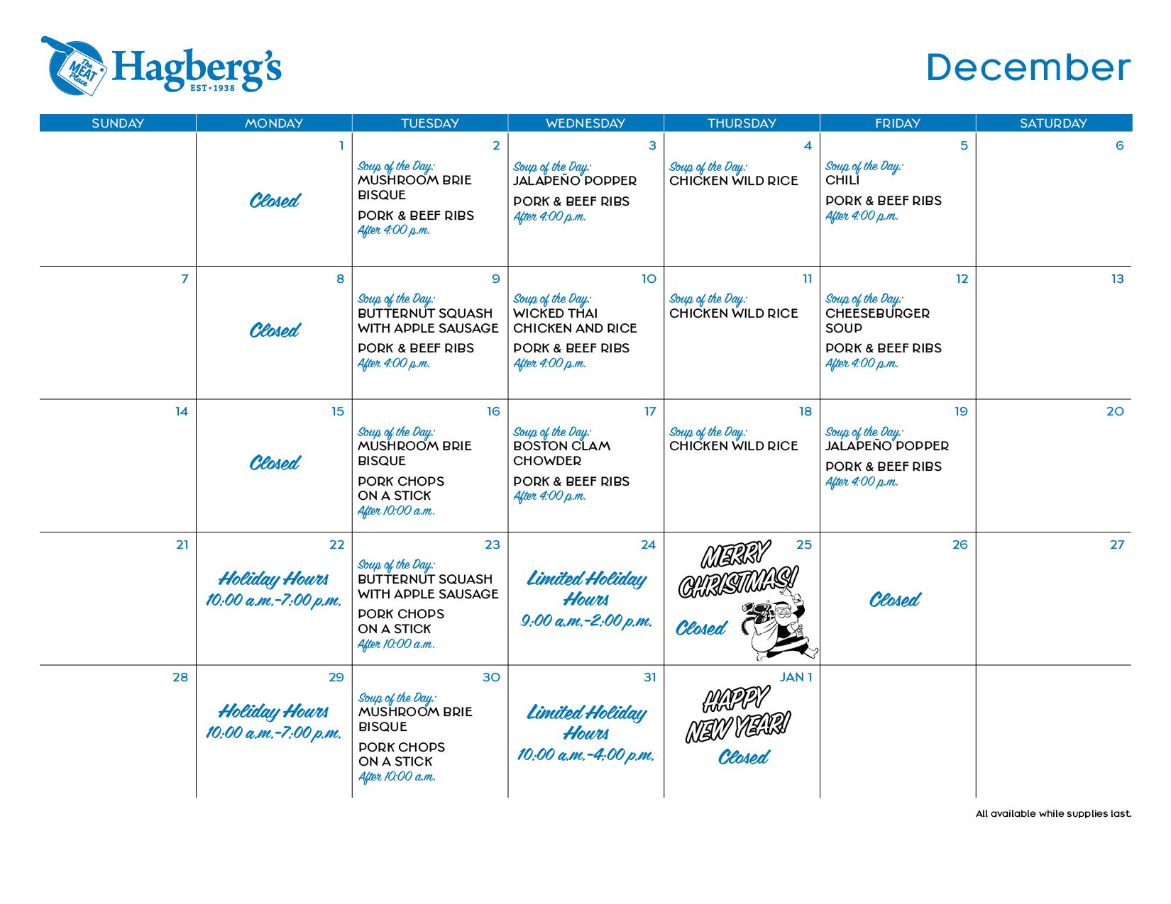 Soup’s on! Like everything we do at Hagberg’s, our soups are created to impress. Fresh ingredients and creative recipes combine with the expert craftsmanship of our Saucier. (In case you’re wondering, Saucier is a fancy way of saying “Soup Maker.”) During soup season, we’re busy chopping, dicing, and stirring the pot in the Hagberg’s kitchen with all kinds of fresh and delicious soups – from classic Chicken Noodle and Tomato Pesto to Jambalaya and Bacon Cheeseburger, and each weekday, we feature a different one.