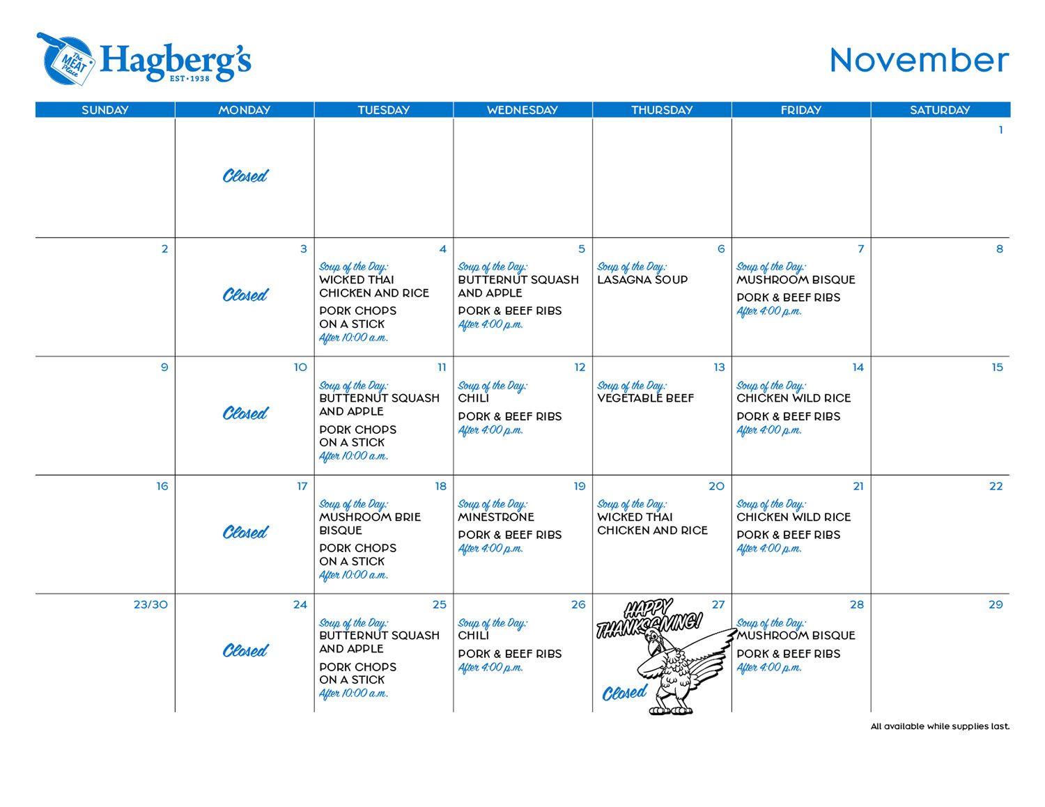 Soup’s on! Like everything we do at Hagberg’s, our soups are created to impress. Fresh ingredients and creative recipes combine with the expert craftsmanship of our Saucier. (In case you’re wondering, Saucier is a fancy way of saying “Soup Maker.”) During soup season, we’re busy chopping, dicing, and stirring the pot in the Hagberg’s kitchen with all kinds of fresh and delicious soups – from classic Chicken Noodle and Tomato Pesto to Jambalaya and Bacon Cheeseburger, and each weekday, we feature a different one.